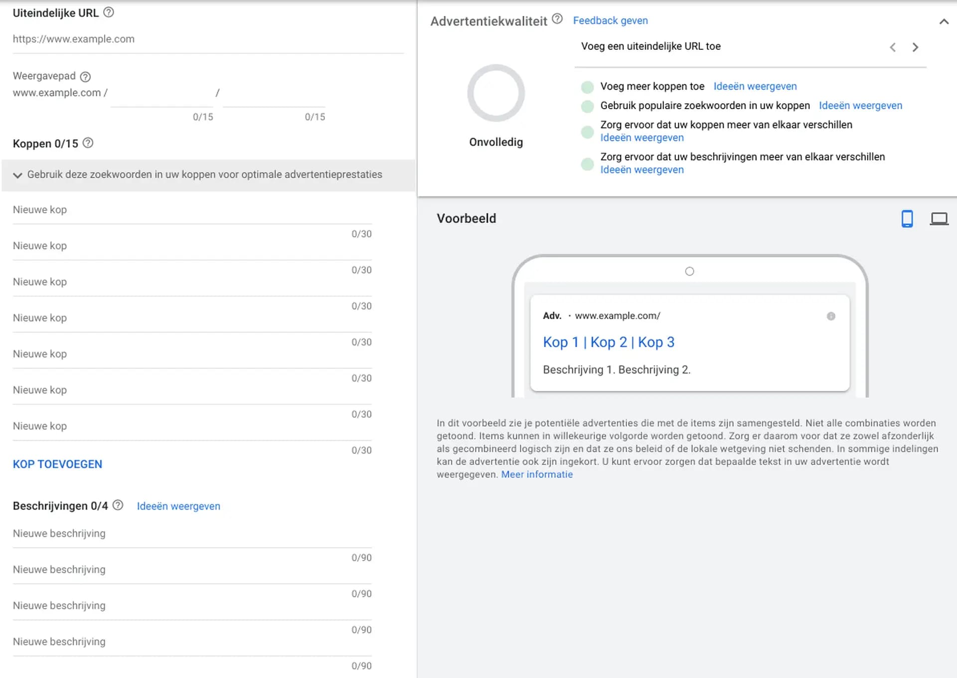1. Hergebruik de goed presterende content uit je uitgebreide tekstadvertenties en focus daarbij op de advertentie sterkte. Tijdens het maken van je advertentie geeft Google je tips hoe je deze sterkte kan verbeteren, bijvoorbeeld door het gebruik van zoekwoorden in de koppen.