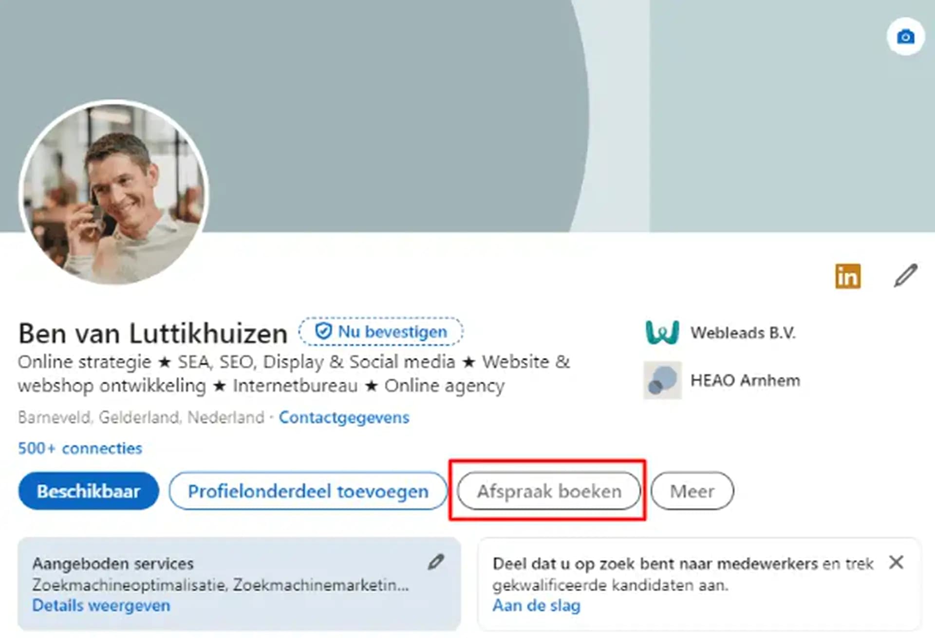 Wanneer je gebruik maakt van LinkedIn Premium (voor slechts €40,- per maand), heb je verschillende voordelen. Zo krijg je toegang tot verschillende extra statistieken en krijg je de mogelijkheid om uitgebreide zoekfilters te gebruiken. Maar een ander voordeel is dat je als ondernemer de mogelijkheid krijgt om een button aan je profiel toe te voegen, gericht op het maken van een afspraak. Dit vergroot de kans dat iemand contact met jou opneemt, wanneer hij/zij jouw profiel bekijkt: