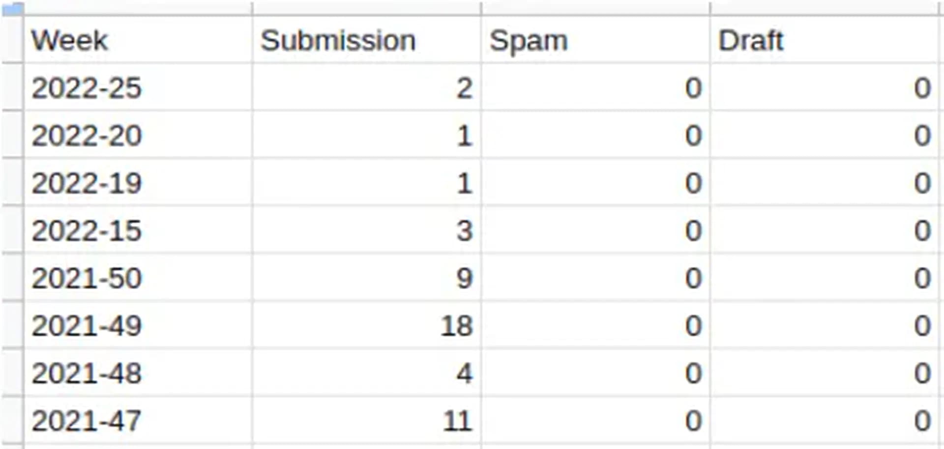 Voorbeeld API export Submission = inzendingen Spam = Spam Draft = niet afgeronde inzendingen (dus bij de preview gestopt).