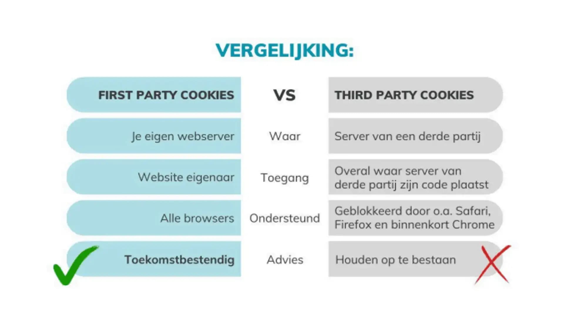 - Third party cookies omzeilen en opslaan als first party data. Je hebt daardoor geen last van de browserbeperkingen van jouw bezoekers, van specifieke instellingen van gebruikers of browsers zoals ad blockers.